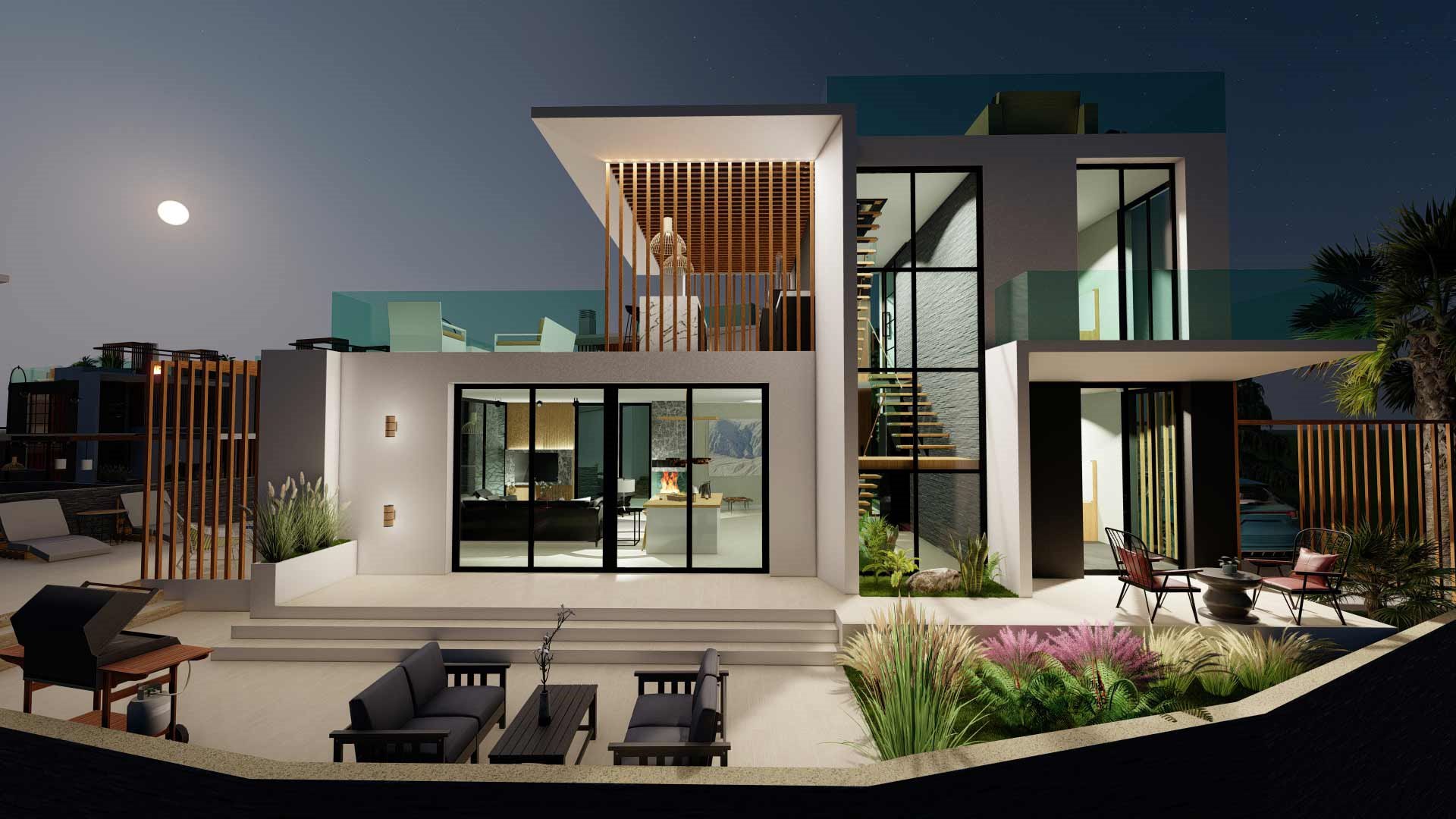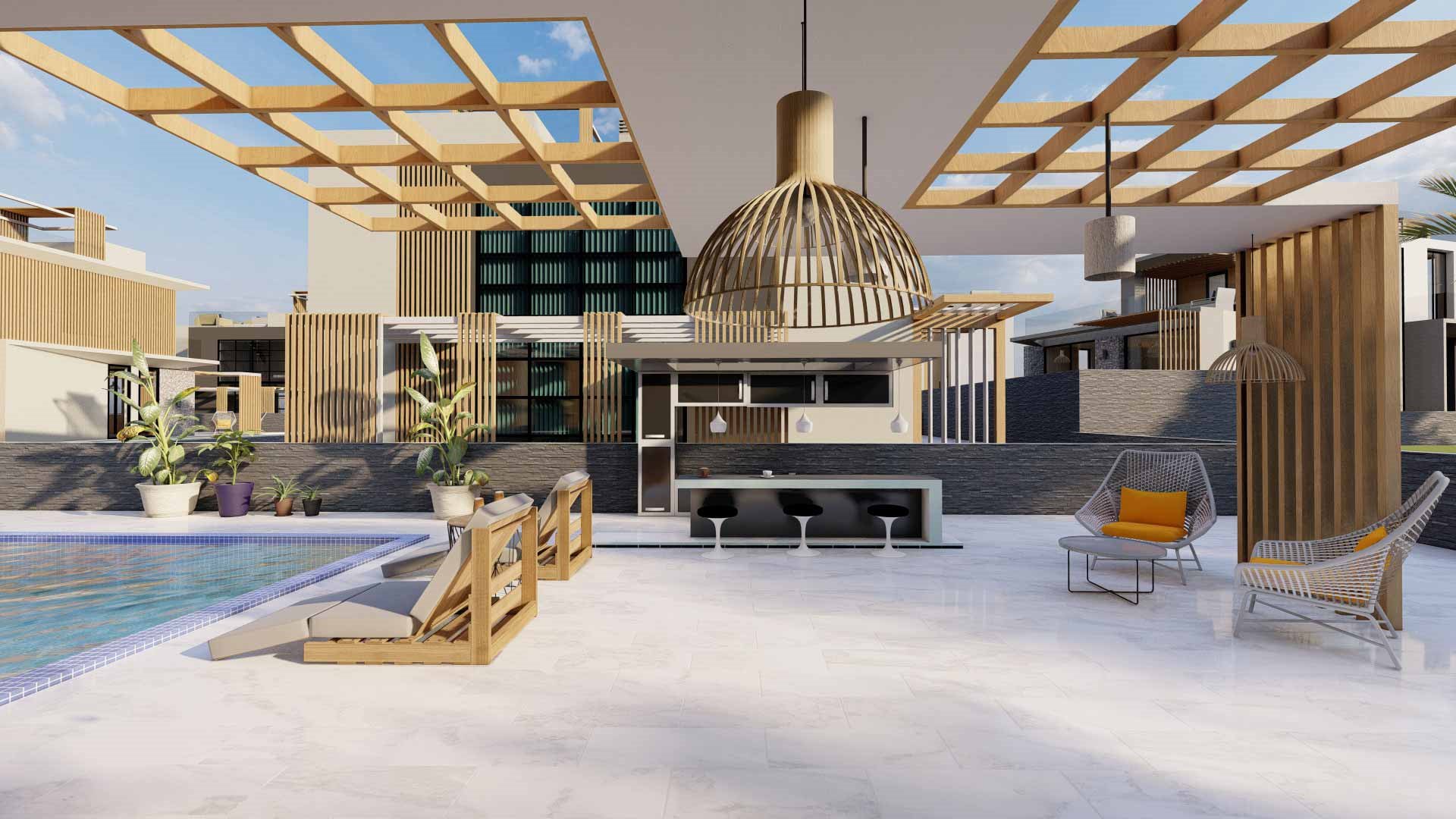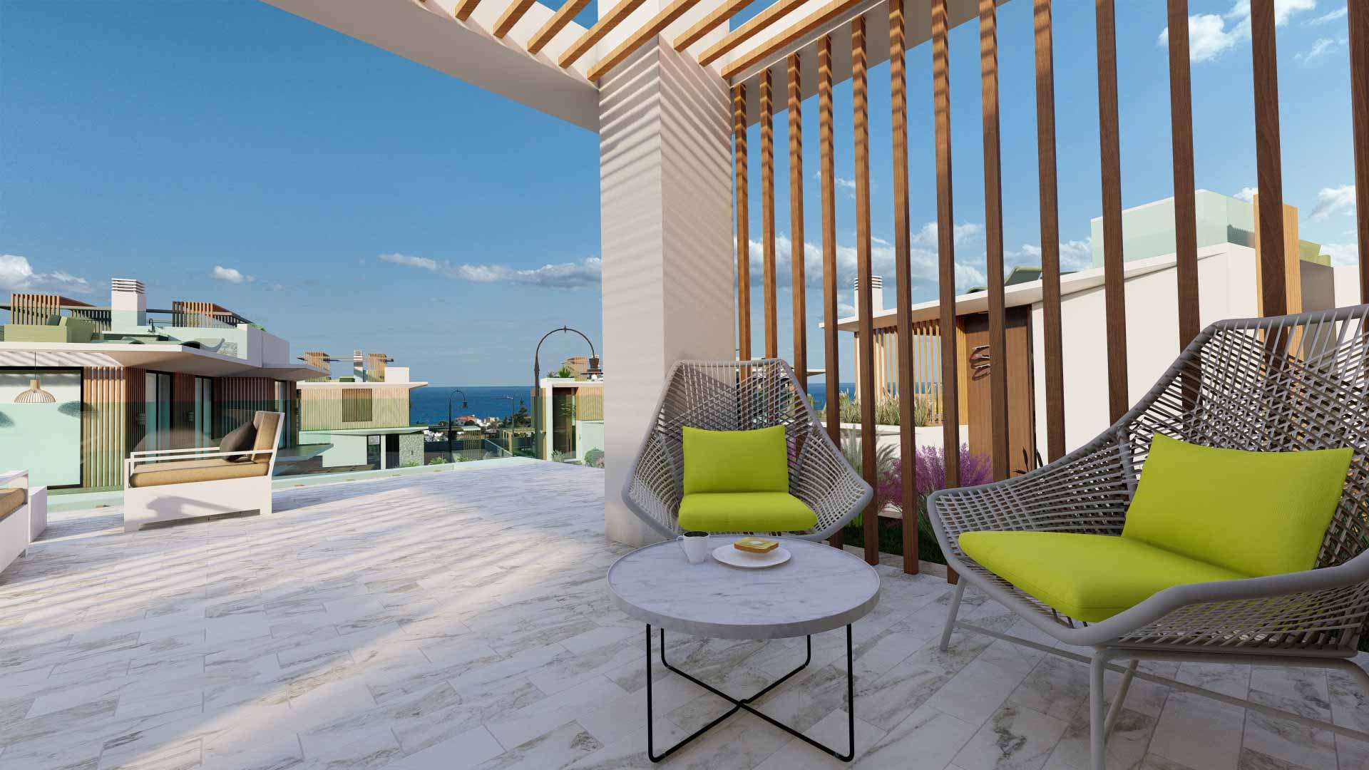 The independent three-bedroom villas, named Elegant, consist of seven units in total. These duplex units have a covered area of 197 square meters, with an additional 80 square meters of roof terrace providing a beautiful sea view.
